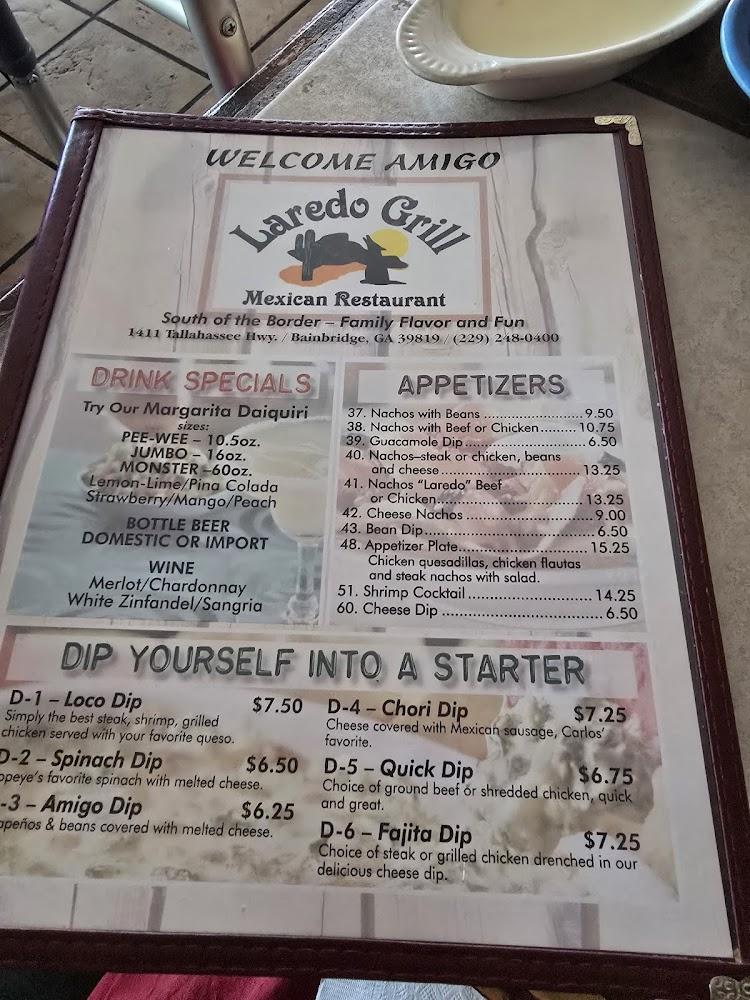 Welcome to Laredo Grill, your go-to Mexican restaurant located at 1411 Tallahassee Hwy, Bainbridge, GA. With a delightful menu featuring traditional dishes, excellent cocktails, and a wide selection of beers and teas, we cater to all tastes, including vegetarian options. Enjoy our cozy and laid-back atmosphere, perfect for solo diners, students, and groups. Whether you're dining in, taking out, or using our delivery service, experience quick service and happy hour specials that brighten your day. Our accessible facilities ensure everyone is welcome. Join us for lunch or dinner and make Laredo Grill your new favorite spot!